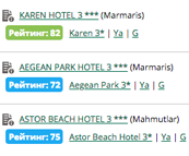 Мы автоматически покажем рейтинги отелей прямо на сайтах туроператоров! Кликните на рейтинг и посмотрите описание отеля на TopHotels, Яндекс, Google.